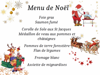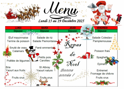 Menus Décembre 2025 Article mis en ligne le 1er décembre 2025 par Mme Montreau Découvrez ci-dessous les menus de la cantine jusqu’au 19 décembre : Menus du 08 au 12 Décembre 2025 Menus du 15 au 19 Décembre 2025 Menu de Noël